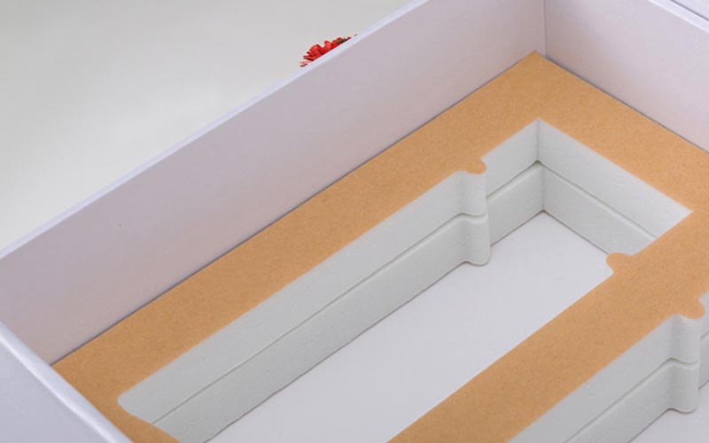 1.材質:盒子面紙用白色珠光紙,彩色印刷,裱1500G雙灰闆,盒子内托用白色EVA植絨橘色。盒子制作比較簡單,翻蓋盒,機器自動話制作。