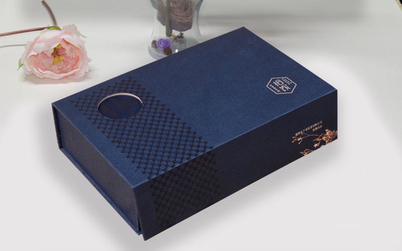 1.材質:盒子面紙用藍色特種紙,表面UV文字LOGO裱1500G雙灰闆盒子表面LOGO一個圓比較特别還可以顯示裏面的産品,盒型爲翻蓋盒内托用紙質内托比較環保适合保健品行業用,整款包裝盒都是手工精心紙質。