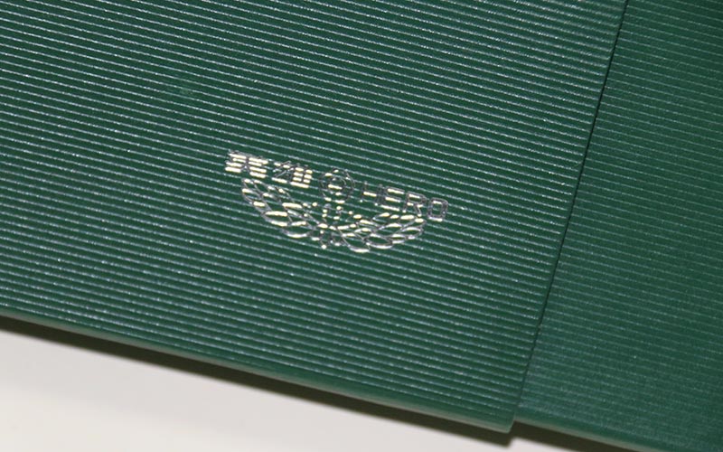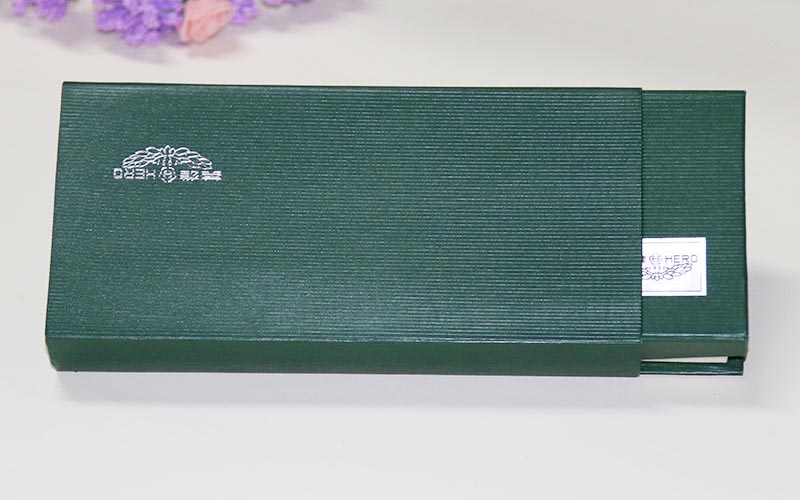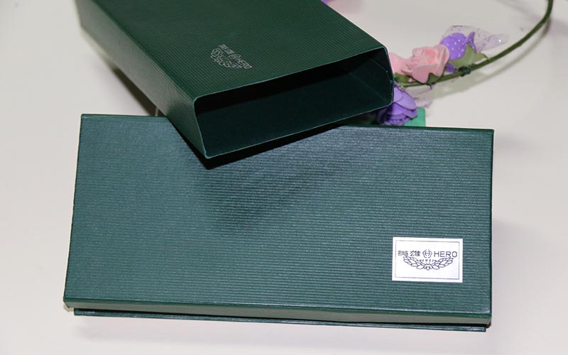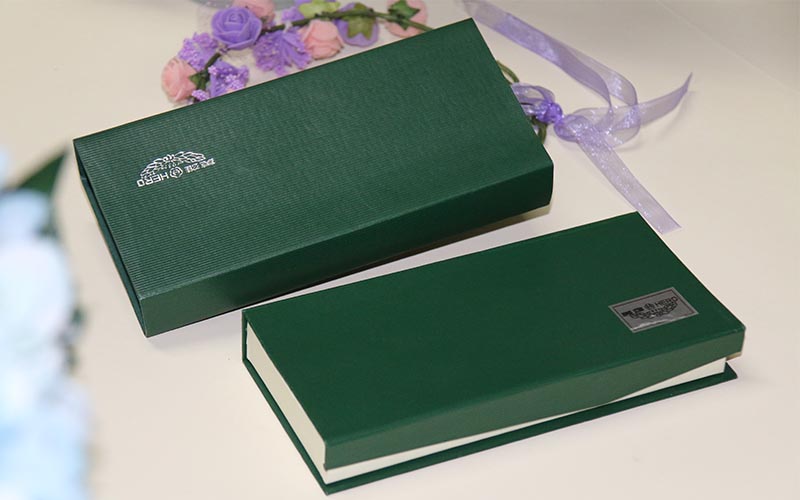 材質:鋼筆禮品盒定制外盒封套採用250G綠色特種紙壓紋路,表面文字LOGO燙銀,盒子皮殼用180G綠的特種紙壓紋路,表面文字絲印白色,盒内蓋子手工貼異型産品,文字燙印,下盒内托用EVA開産品模型裱綢布。盒型爲翻蓋盒此款盒子是精簡版抽屜盒