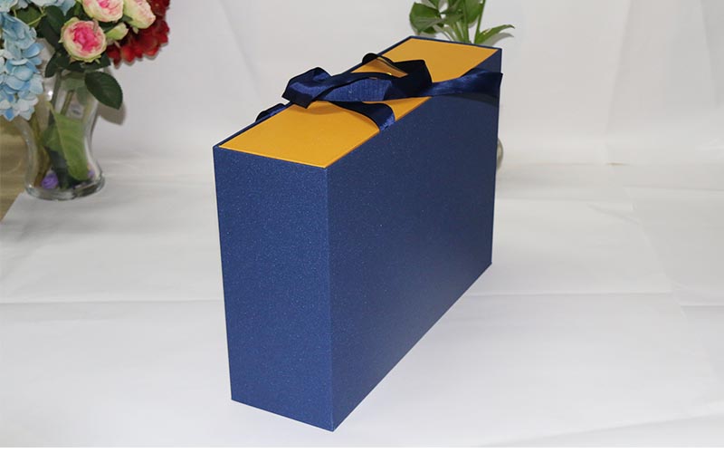 1.材質:盒子面紙用藍色磨砂特種紙,内盒也在用金黃色特種紙,裱1500G雙灰闆成品粘兩條絲帶方便客戶攜帶貨物,切記貨物太重的不能這樣。不然到時候繩子斷開産品就會受損,盒子比較大整款盒子都是手工制作。
