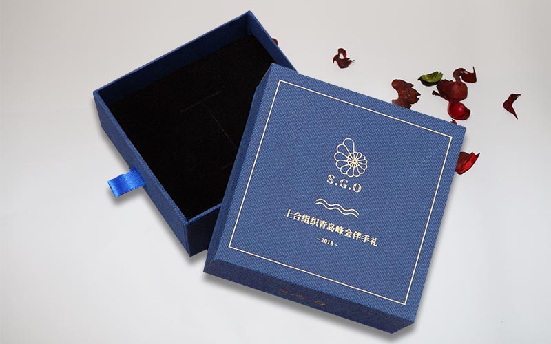 1.材質:盒子面紙採用小石頭紋的藍色特種紙,盒子表面文字LOGO燙金色,裱1200G單白闆,整體盒子爲抽屜盒性,抽拉的地方裝藍色的絲帶。整款盒子手工制作。