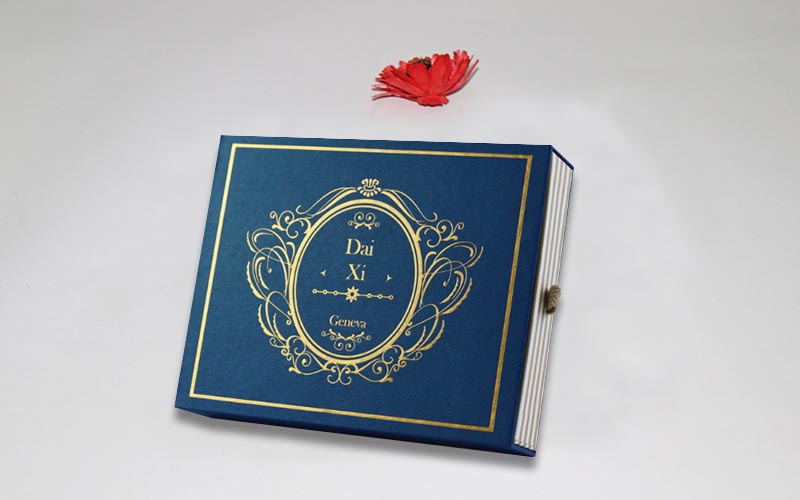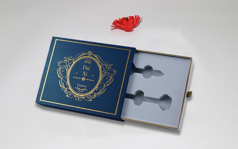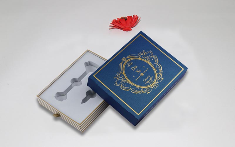 1.材質:外盒子用藍色珠光紋路的特種紙,盒子面紙文案燙黃金,裱1200G雙灰闆 ,抽盒157G銅版紙彩色印刷啞膜,裱1200G雙灰闆,内托用白色EVA開V槽固定産品。整款盒子機械化制作。