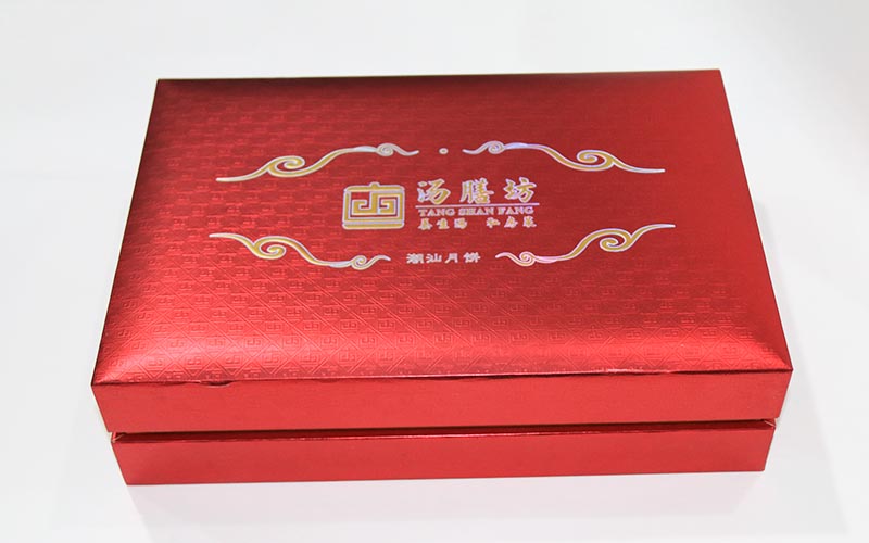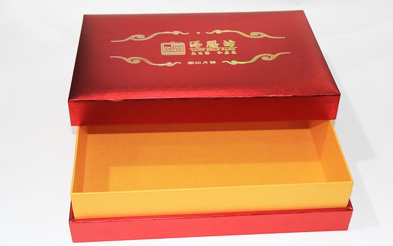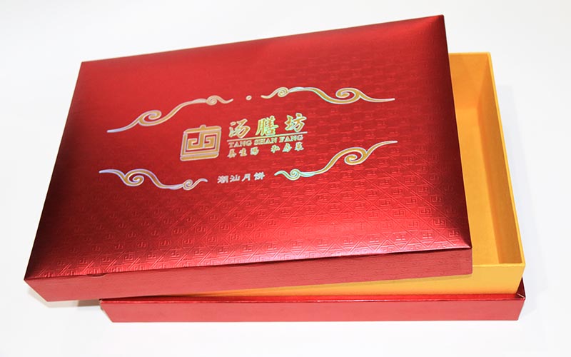 1.材質:月餅包裝盒定制外盒材質用250G厚度紅色紋路特種紙,表面燙金燙銀激凸文字,上盒裱5MM的密度闆,加一層2MM的海綿,盒子内部結構用黃色萊利紋裱1800G光滑雙灰闆,下盒上盒一樣材質。盒型爲上下天地盒整款盒子都是手工制作。