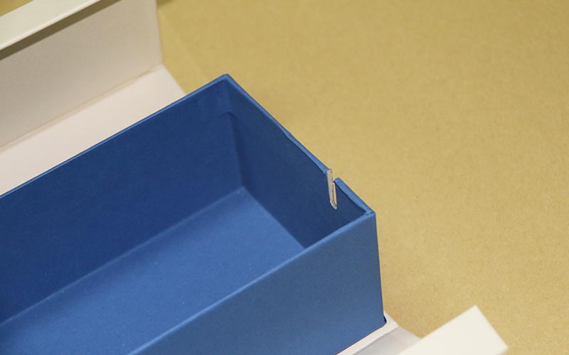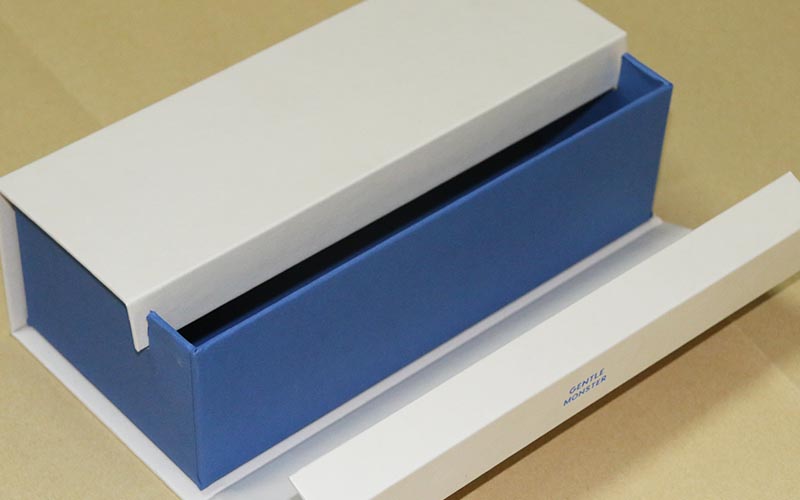1.材質:外皮殼用米白色觸感特種紙,(特别有手感的一款紙)燙藍金LOGO,裱1500G立格灰闆,内盒同樣用藍色特種紙裱1500G雙灰闆,内盒左右兩邊開兩個槽位,盒子翻開的地方更好的卡進去,不留縫隙,手工制作。