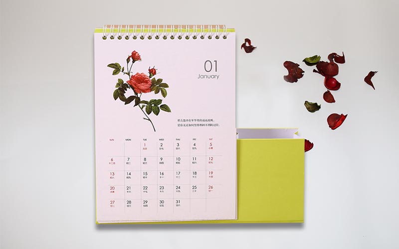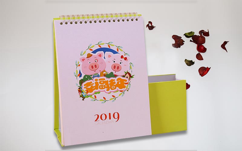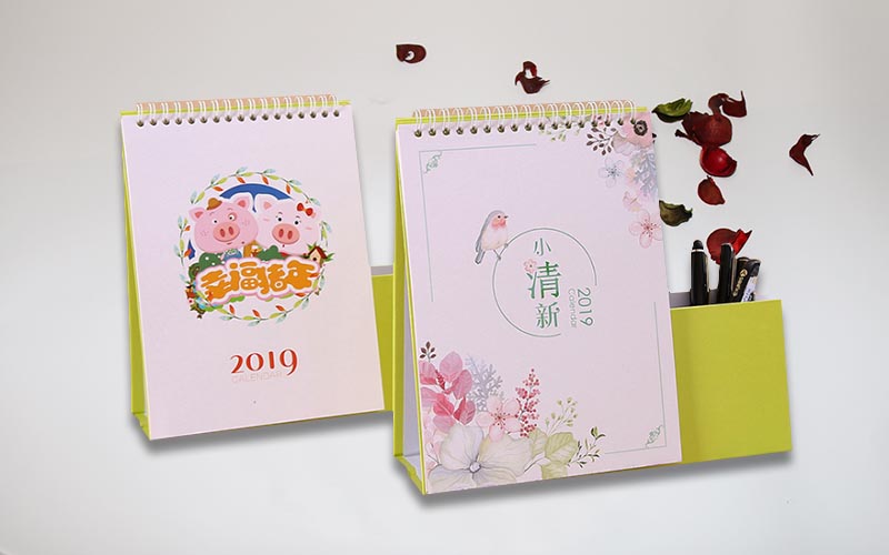 1.材質:異型的台曆,支架用157G銅版紙彩色印刷單面啞膜 ,裱1500G雙灰闆,内頁13張用250G啞粉紙,彩色印刷,外支架也可以做一些簡單的工藝可以燙金公司的文字信息,内有有的客戶會放一個自己的封面。封面也是可以燙金UV等不同的工藝。手工制作裝訂YO圈。
